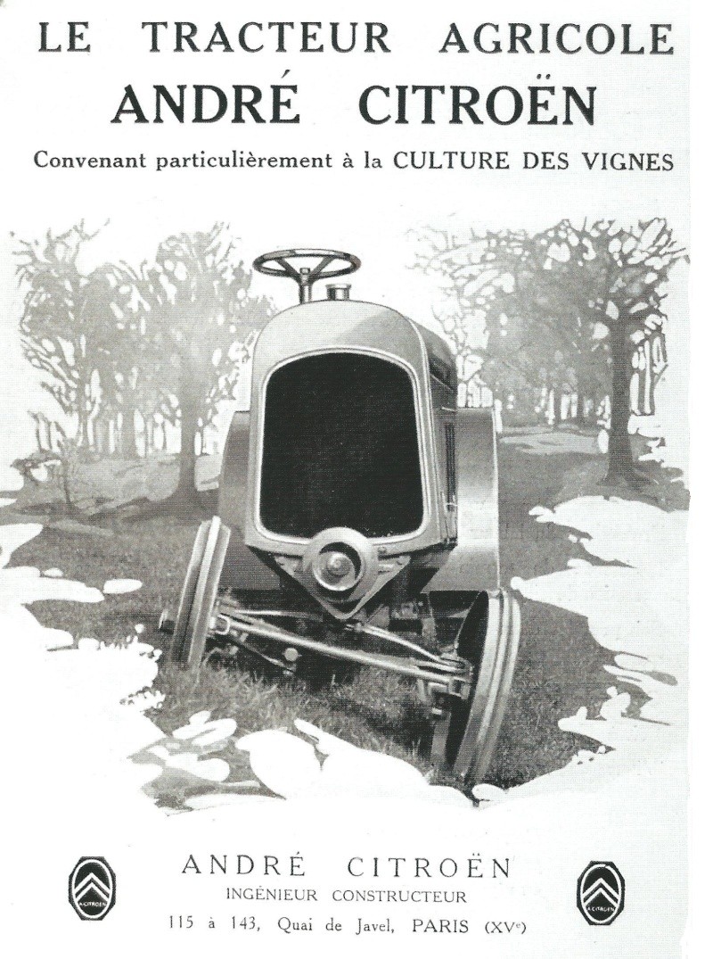 Pero André Citroën fue un poco más allá, pues también planeaba estar presente en todas las áreas de la locomoción con la idea de que pronto se necesitaría de herramientas motorizadas para acelerar la fabricación de alimentos, y para esto también desarrolló un vehículo. Se trató de un modelo de tractor para las tareas agrícolas livianas, en este caso las tareas en viñedos. Una actividad muy importante en la campiña francesa.