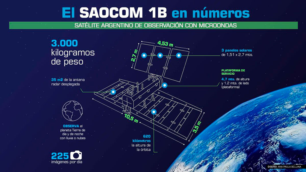 El SAOCOM 1B (Sistema Argentino de Observación Con Microondas) fue enviado al espacio para convertirse en los ojos de los argentinos en el cielo. Se encargará de observar la tierra y escanearla. De esa manera poder obtener mapas de humedad diarios y desarrollar una gran base de datos públicos que beneficiará la identificación de zonas óptimas para el cultivo y ayudar a detectar los lugares para fertilizar.