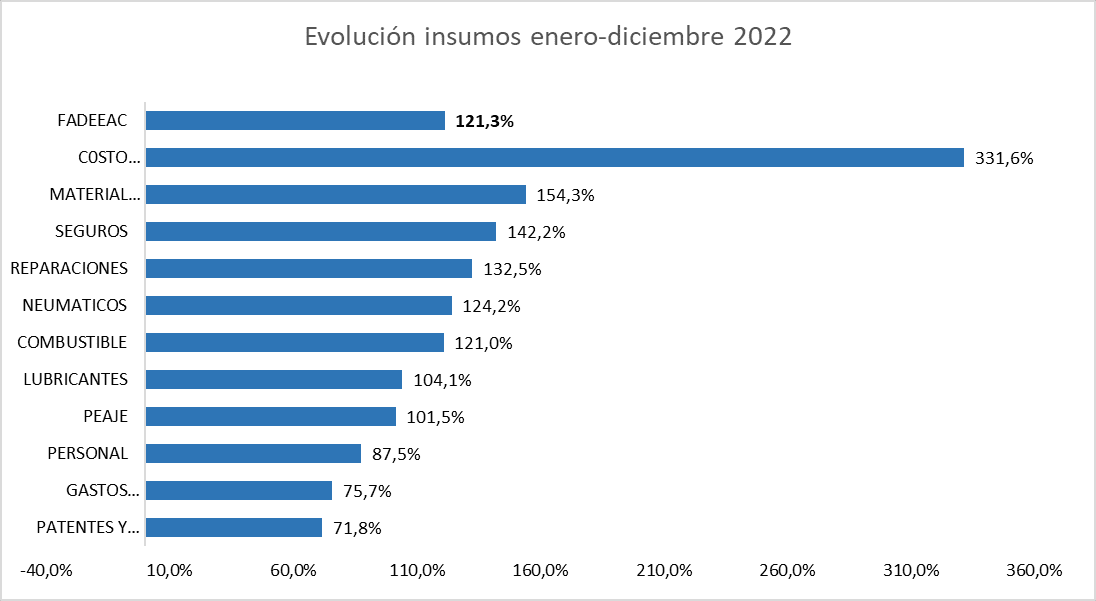El aumento acumulado a lo largo del ejercicio, según Fadeeac, fue el más grande en 20 años, y estuvo motorizado por algunos rubros con incrementos sustanciales como Combustible, 121%; Neumáticos, 124%; y Material Rodante, 154%.