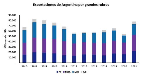 PP: Productos Primarios – MOA: Manufacturas de Origen Agropecuario – MOI: Manufacturas de Origen Industrial – CyE: Combustible y Energía. Fuente: BCCBA en base a INDEC