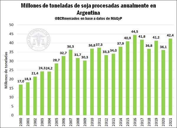 El año pasado se procesaron un total de 42,4 millones de toneladas de soja en la Argentina. Se trata del segundo mayor volumen de la historia, sólo superado por el 2016 cuando se molieron alrededor de 44,5 millones de toneladas, según un informe de la Bolsa de Comercio de Rosario (BCR).
