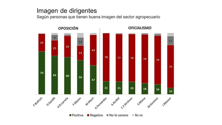 “Entre las personas que tienen una buena imagen del campo, los dirigentes del oficialismo solo alcanzan el 20% de imagen positiva. En cambio, los dirigentes de la oposición alcanzan altos niveles de aceptación, que van del 50% al 70%”, señaló el trabajo. De hecho, el ranking es encabezado por la titular del PRO, Patricia Bullrich, con un 70% de opinión positiva, seguido por el candidato a diputado, Diego Santilli, con 63% y por el alcalde de Buenos Aires, Horacio Rodríguez Larreta, con 60%.