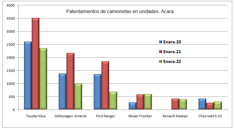 La camioneta más vendida en enero siguió siendo Toyota Hilux con 2351 unidades, seguida muy de cerca por Volkswagen Amarok (2090) y Ford Ranger (1137). Atrás vienen Chevrolet S-10, Fiat Toro y Nissan Frontier. La novedad del mercado es la aparición de Alaskan de Renault.
