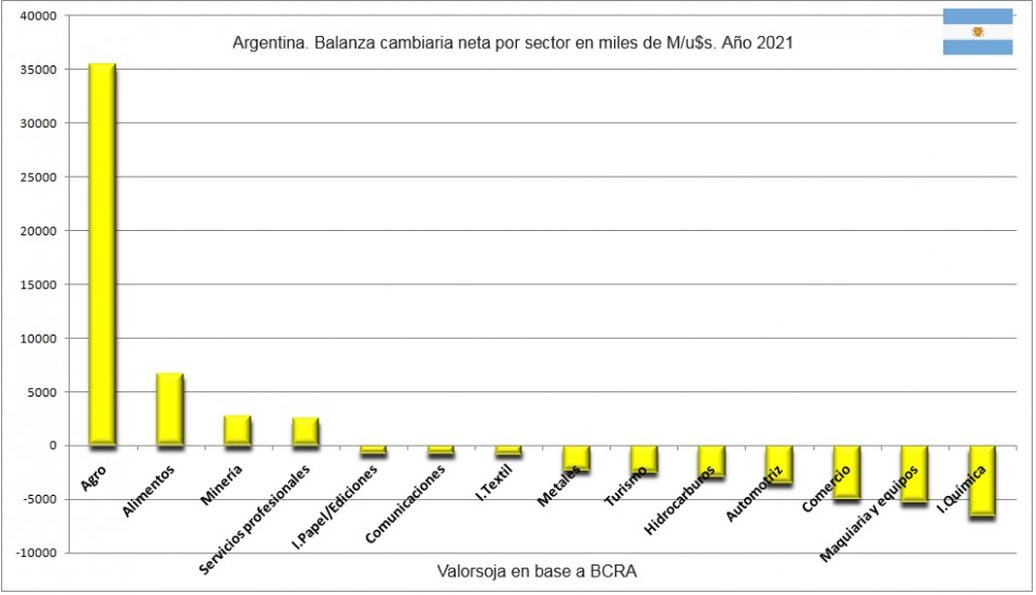 La agroindustria es, por lejos, el sector de la economía argentina que más dólares genera. Lo siguen, muy de atrás, el sector «alimentos y bebidas» con 6713 millones de dólares netos ingresados el año pasado, y la minería con 2760 millones de dólares.