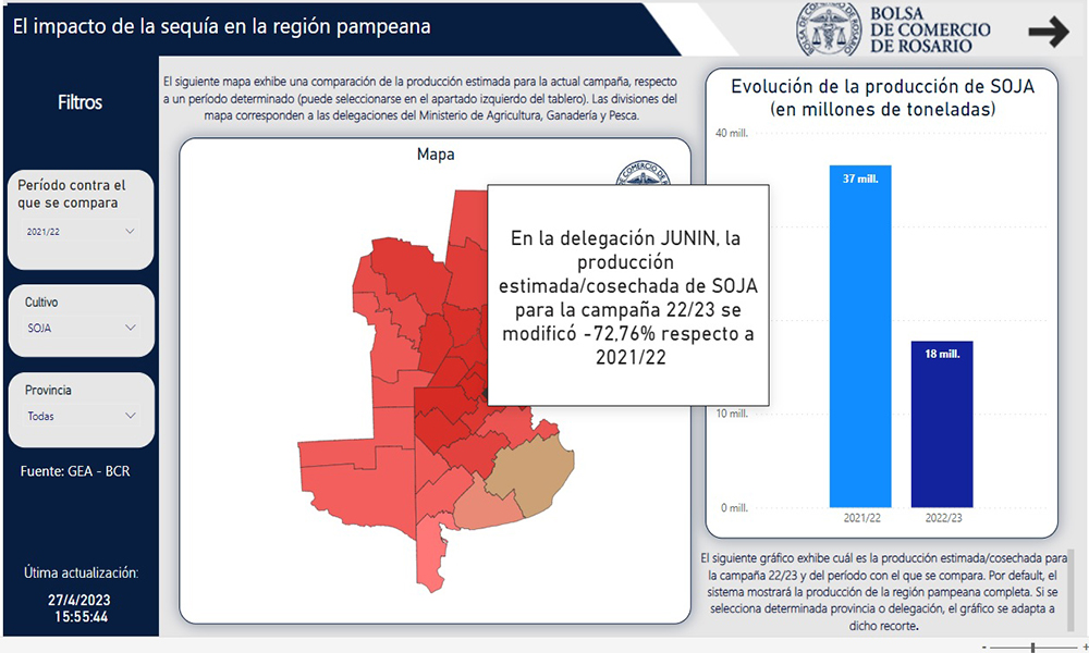 El mapa interactivo, divide la provincia de Buenos Aires en 12 regiones, una de estas regiones encuentra a Junín como lugar de referencia. Y si uno hace foco en el partido de Junín y apunta al cultivo de soja, el mapa destaca textual: “En la delegación JUNIN, la producción Estimada/Cosechada de SOJA para la campaña 2022/23 se modificó a -72,76 respecto a 2021/22”. Es decir, en Junín cayó la cosecha, respecto a la campaña anterior casi un 73%.