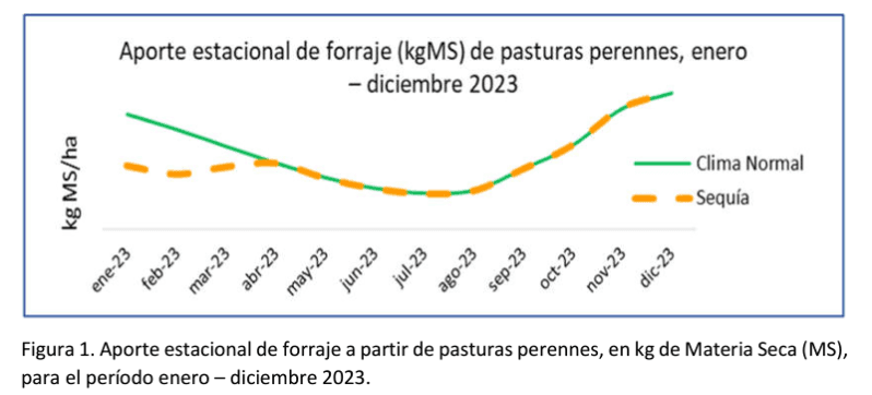 Se realizó una proyección de la oferta forrajera y de la disponibilidad de forrajes conservados para todo el ejercicio 2023, teniendo en cuenta el impacto del déficit de lluvias registrado en el primer trimestre del año y una tendencia a situaciones normales de lluvias y temperaturas el resto del año.