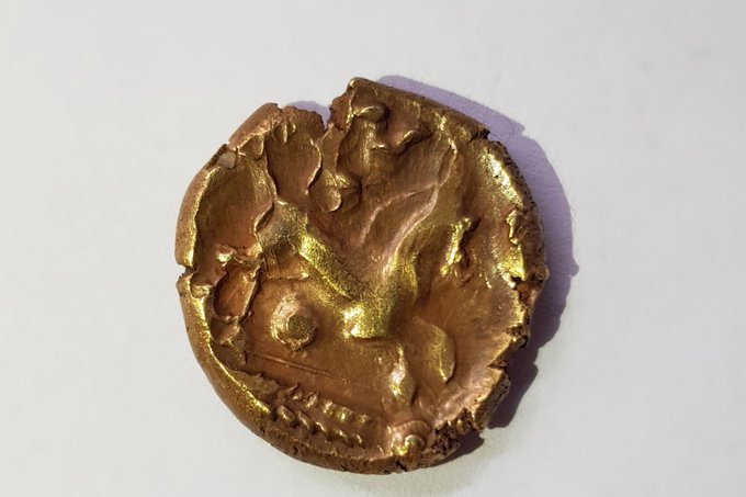 Curiosamente el hombre, cuya identidad no se ha dado a conocer, estaba desprovisto del detector de metales que acostumbra emplear y estaba observando un ave. Al limpiar el barro, el cazatesoros descubrió que era una moneda de oro de 2.000 años de antigüedad. Cuando halló la segunda pieza a un metro de distancia, regresó a su casa para recoger su detector de metales y horas después encontró 1.300 monedas que datan de los años 40-50 d.C.