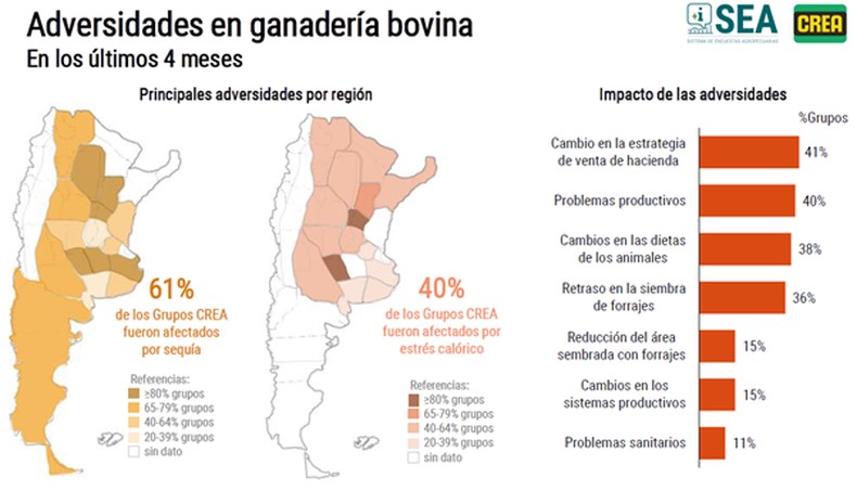 En los últimos cuatro meses, un 68% de los grupos CREA informó haber sido afectado por restricciones hídricas que redujeron la disponibilidad de recursos forrajeros, mientras que una proporción similar experimentó golpes de calor que afectaron a los rodeos bovinos.