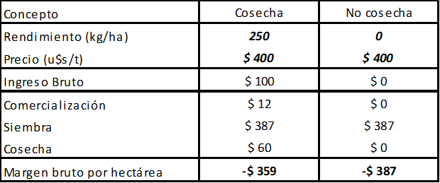 Se puede realizar un ejercicio con los valores obtenidos en el informe del SIBER: con un rendimiento de 250 kg/ha y un precio a cosecha de 400 u$s por tonelada, tendríamos un ingreso de u$s 100 por hectárea, descontando u$s 12 de comercialización y u$s 60 de cosecha; nos daría un resultado de u$s 28 dólares por hectárea. Cabe aclarar, que dicho resultado no se trata de un beneficio económico, faltarían descontar costos sumamente relevantes como los referidos a siembra (labores e insumos), arrendamiento (si corresponde), y otros no menos importantes que definen el margen neto como impuestos, gastos de estructura, etc. Lo que se quiere transmitir es que, obteniendo este rinde, sí resulta conveniente efectuar la cosecha, ya que esos u$s 28 por hectárea pueden ser utilizados para afrontar los demás costos. Para un caso de soja de primera en campo propio, el margen bruto es de u$s -359 si se cosecha y u$s -387 si no se cosecha, por lo tanto resulta una buena decisión efectuar la cosecha para disminuir pérdidas.
