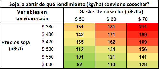 Para responder esta pregunta se utiliza el cuadro de resultados económicos por hectárea, donde el ingreso depende los rendimientos obtenidos y el precio del grano al momento de cosecha; en segunda instancia tenemos a los costos que incluye aquellos referidos a la siembra, arrendamiento, comercialización y cosecha. Los dos primeros se tratan de erogaciones ya ejecutadas o comprometidas por los productores, mientras que los costos de comercialización y cosecha no se efectúan en caso de que se decida no realizar la cosecha. De esta forma, para que resulte conveniente realizar la cosecha se deberá dar la siguiente condición: INGRESO > (COMERCIALIZACIÓN + COSECHA)