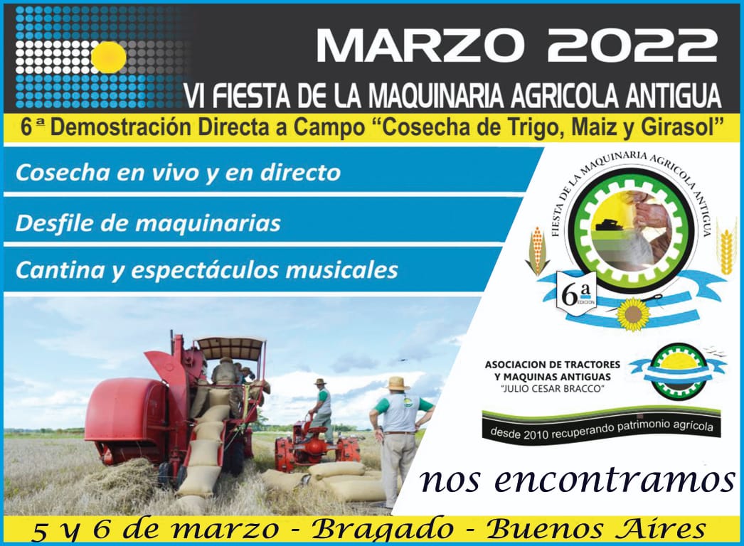 Como en cada edición, este próximo sábado 5 y domingo 6, el encuentro gratuito que convoca a centenares de amantes de la “historia chacarera”, se desarrollará en la localidad bonaerense de Bragado. Las dos jornadas se realizarán en el Parque Industrial local ubicado sobre Ruta Nacional 5 y con entrada gratuita.