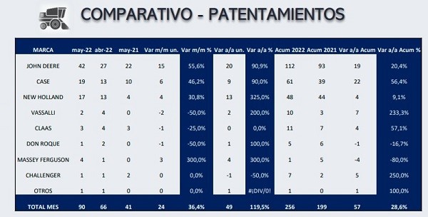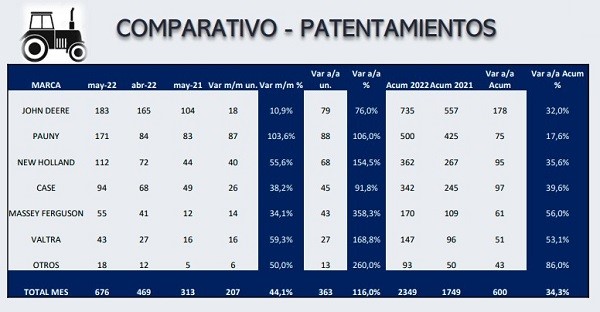 En cuanto a tractores, se patentaron 676 unidades, una suba del 44,1% comparado contra las 469 unidades de abril, y del 116% en la medición interanual, contras las 313 unidades de mayo de 2021.