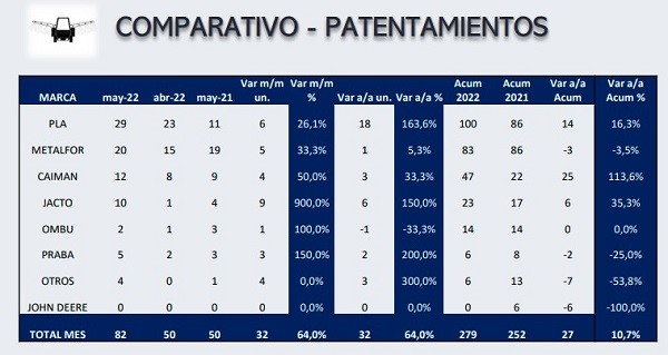 En mayo se patentaron 82 pulverizadoras un 64% más tanto en la comparación mensual como en la interanual. En este rubro, el mercado lo lidera PLA con el 36% de cuota de mercado y Metalfor con 30%, mientras que Caiman se ubica en el tercer lugar con el 17%.