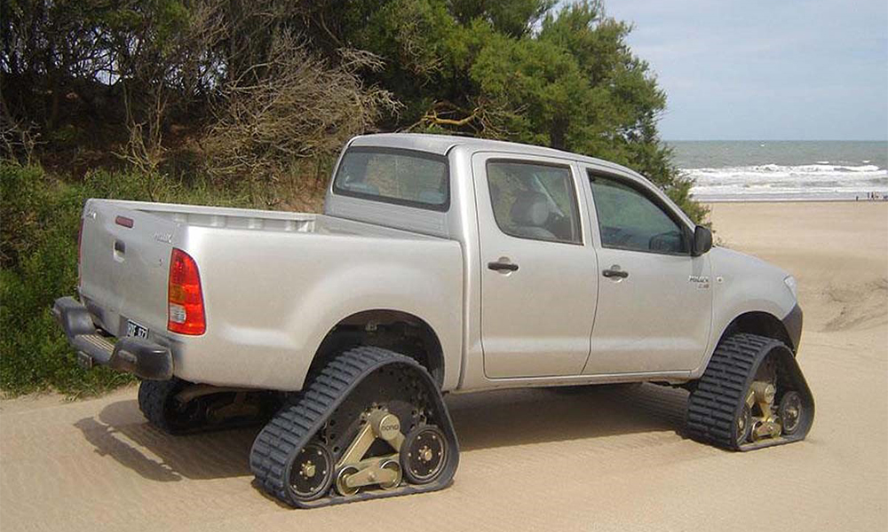 Hay dos buenas noticias: la primera es que no es un producto artesanal sino de producción industrial, ya que es exportado a muchos países, mientras que la segunda nace de que no hay que modificar nada en la camioneta; se quitan los neumáticos y se instalan las orugas.