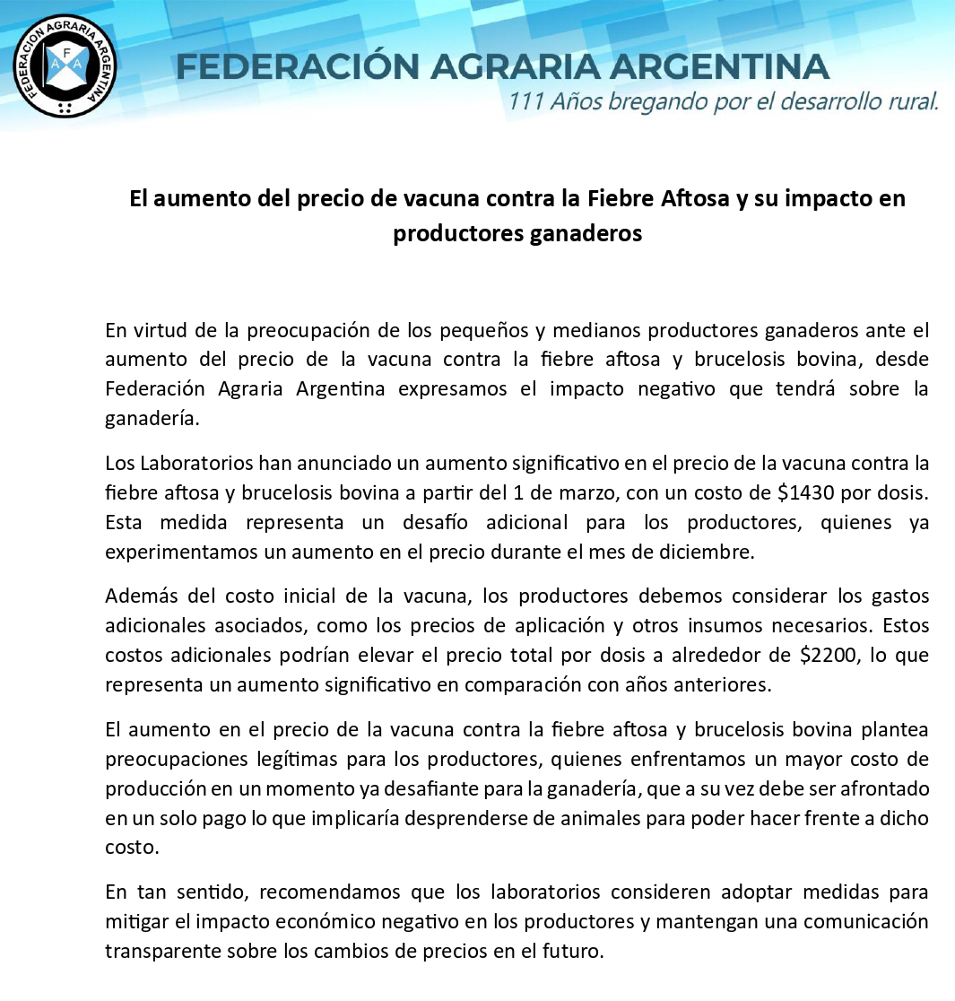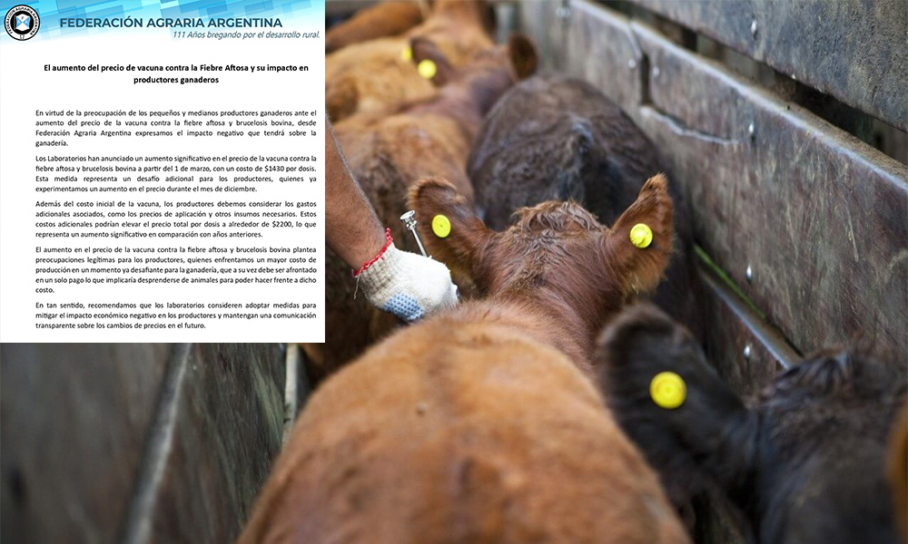 «Los Laboratorios han anunciado un aumento significativo en el precio de la vacuna contra la fiebre aftosa y brucelosis bovina a partir del 1 de marzo, con un costo de $1430 por dosis. Esta medida representa un desafío adicional para los productores, quienes ya experimentamos un aumento en el precio durante el mes de diciembre», indicó la entidad en un comunicado.