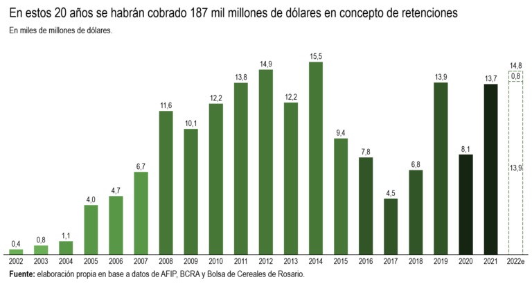 Este año, a pesar de la sequía, los súper-precios de las materias primas entregarán una mayor recaudación por retenciones que en 2021, pese a lo cual el gobierno nacional decidió elevar las retenciones una vez más para recaudar unos 800 millones de dólares adicionales. Después de 2014 y 2012, éste podría ser el año en que más retenciones se recauden. Mientras la Sociedad Rural Argentina presenta un amparo en Córdoba con el objeto de que las retenciones sean declaradas ilegales (con el argumento de que el gobierno necesitaba para cobrarlas la aprobación del Presupuesto Nacional 2022), el ministro de Economía declaró que sería importante “crear un mecanismo para redistribuir la renta inesperada por el incremento global de precios de los commodities”. Sería bueno recordarle al ministro que ya hay al menos dos impuestos capturando esa “renta inesperada”: las retenciones y Ganancias.