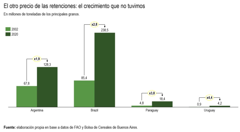 Como se observa en el siguiente gráfico, los tres países vecinos que no implementaron impuestos a la exportación vieron su producción crecer de manera significativa, ya que en todos los casos invirtieron más que Argentina: ampliaron el área productiva, cuentan con un parque de maquinaria agrícola más moderno y joven (por lo tanto más eficiente), utilizan más fertilizante por hectárea, tienen un menú más amplio de eventos biotecnológicos, pueden remunerar mejor a sus profesionales, avanzaron en el crecimiento de área irrigada, etc.