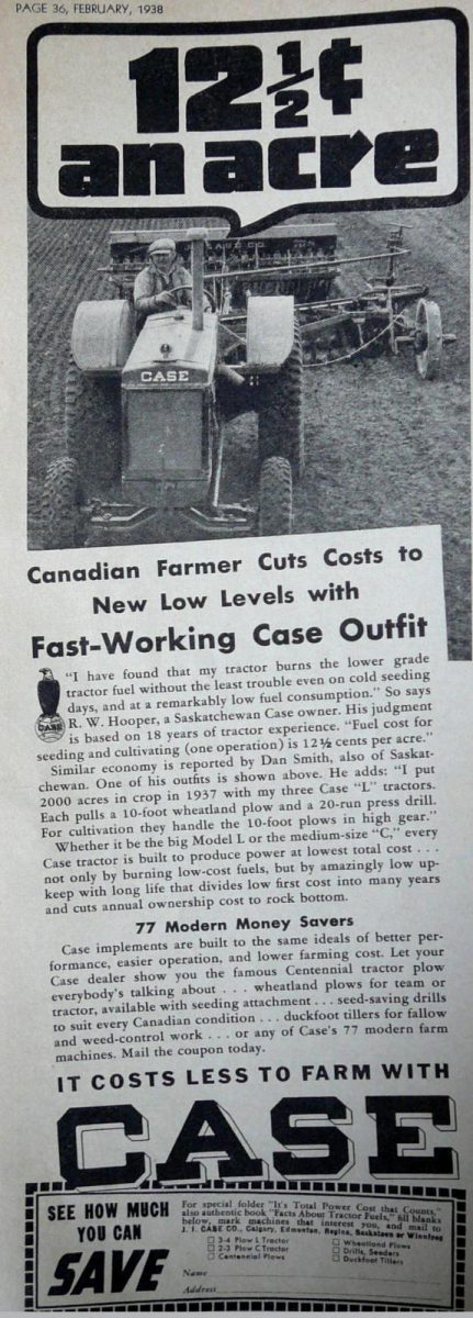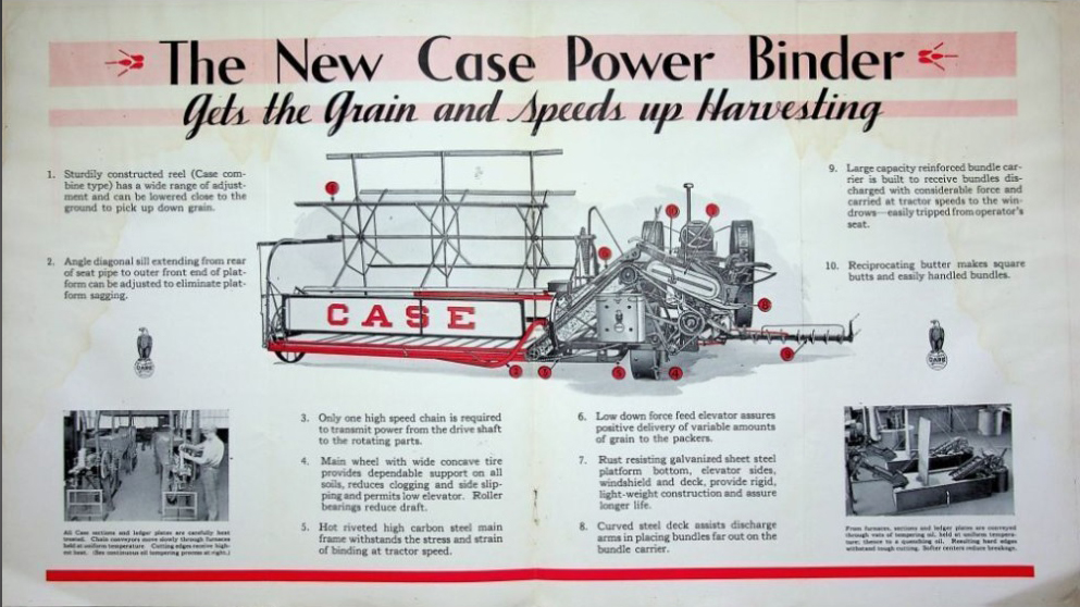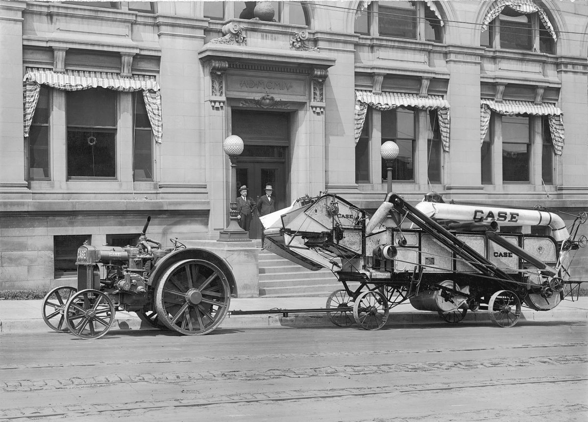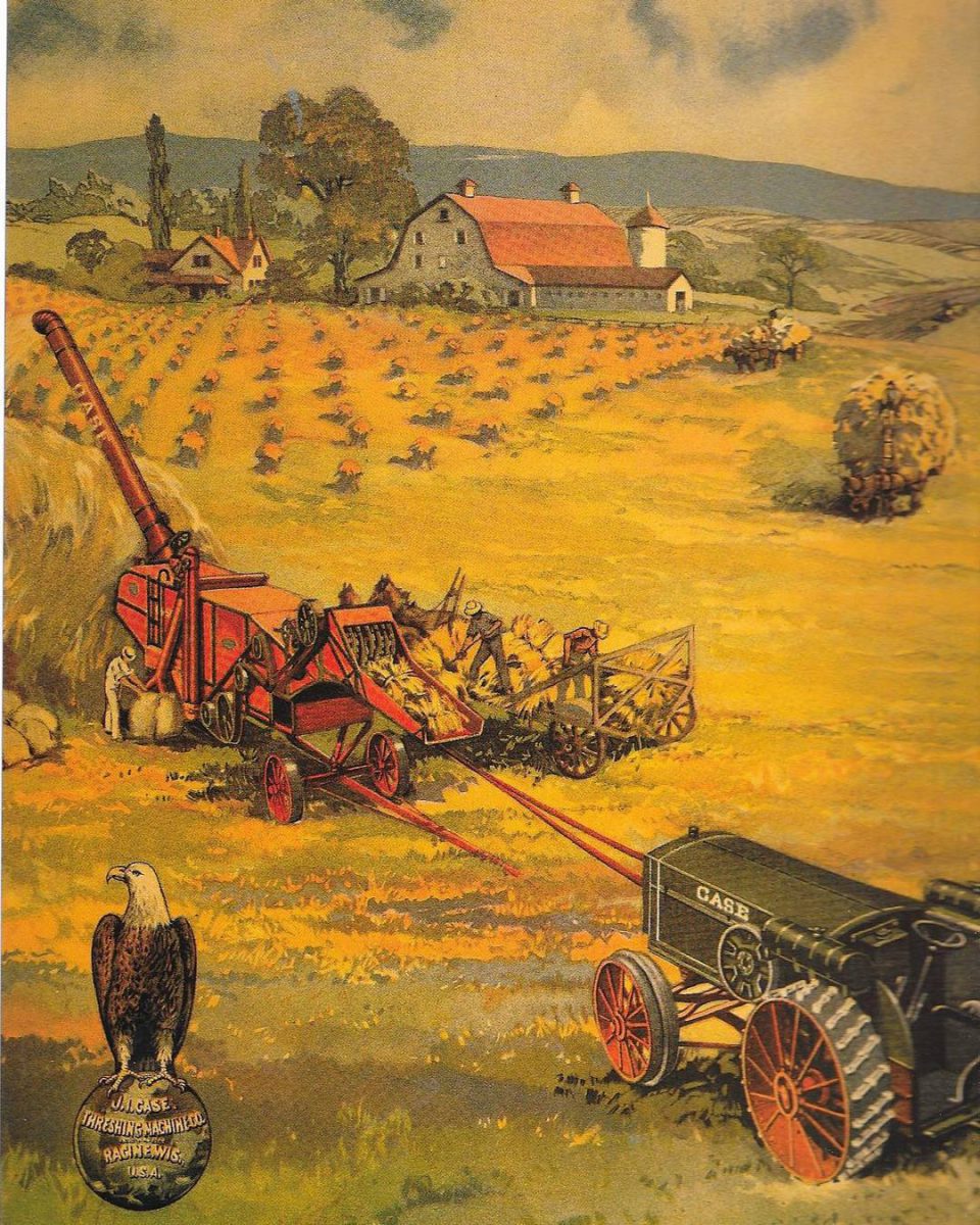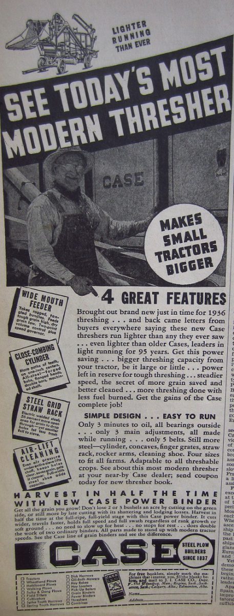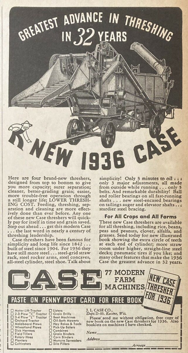 Anuncio de una máquina trilladora CASE, la foto es del año 1937.