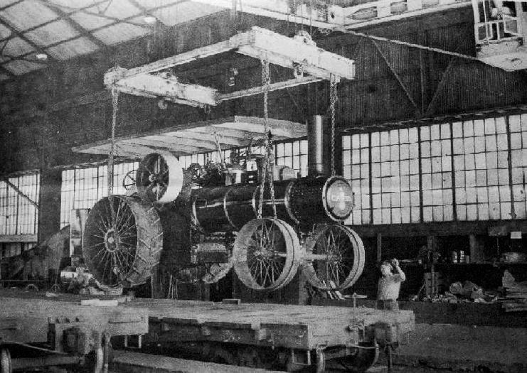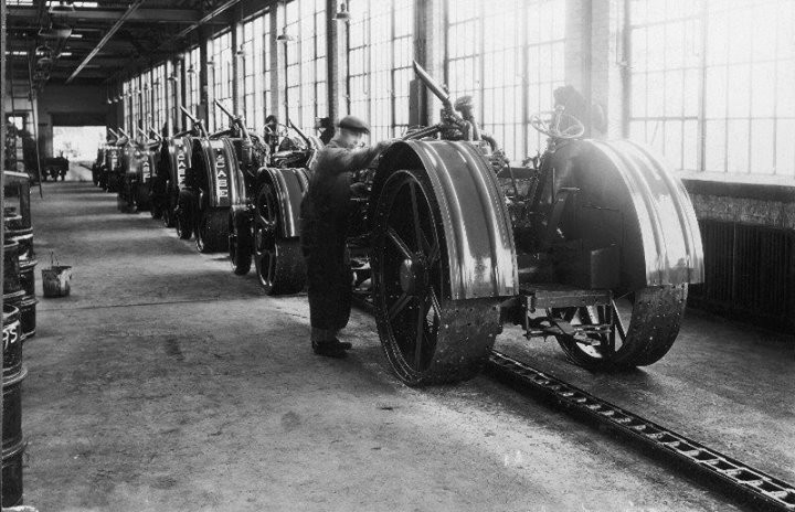 Vista del interior de la fábrica CASE, se ve el tren de montaje. Foto del año 1928.