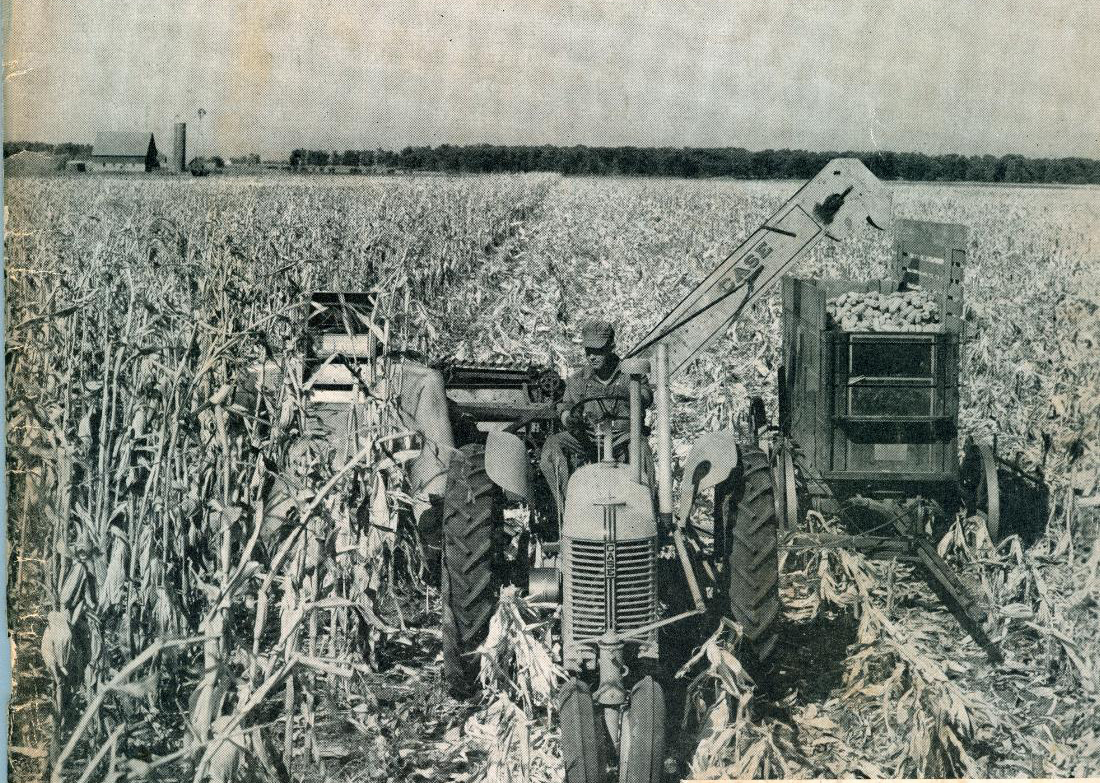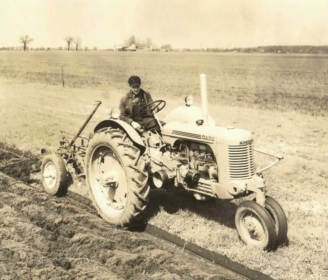 Tractor CASE modelo DC3 arrastrando una recolectora de maíz. Foto del año 1949.