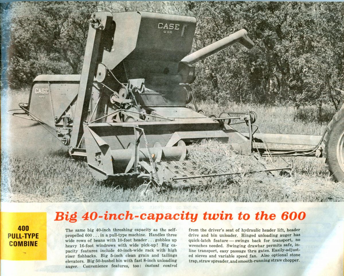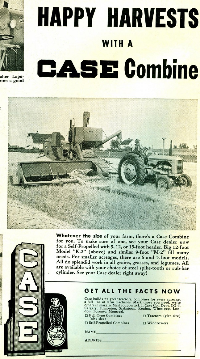 Tractor CASE DC4 tirando una Cosechadora CASE K2 con motor 4 cilindros Little Case que hace funcionar la trilladora. Folleto del año 1952.