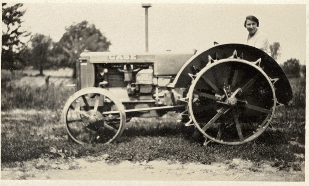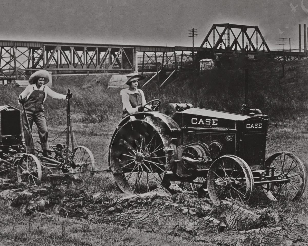 Dos mujeres en plena tarea de campo. Una maneja un Case Crossmotor y la otra conduce un arado. Foto del año 1920-25.