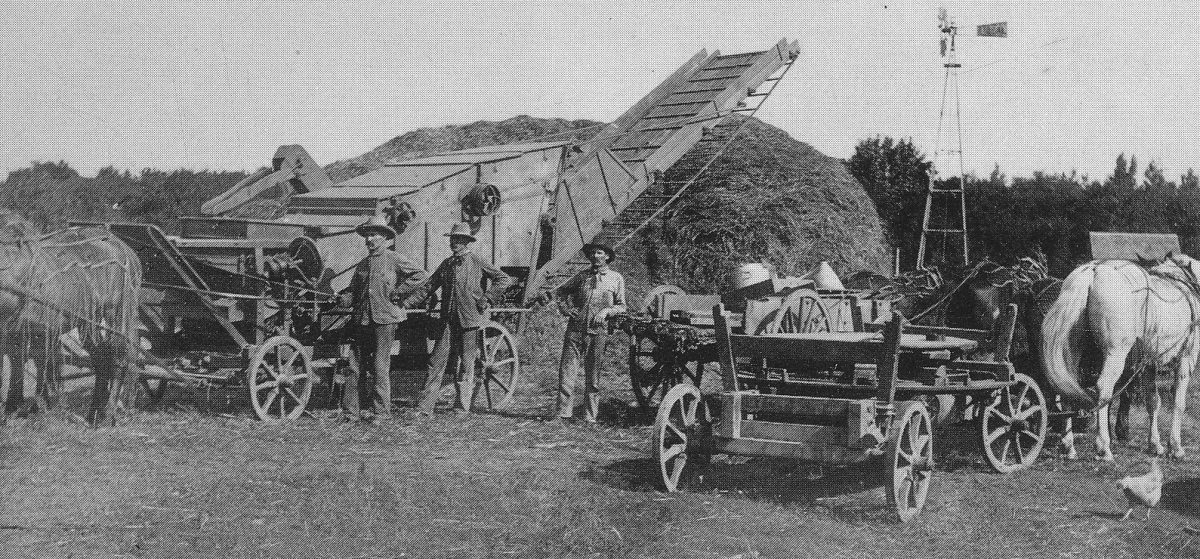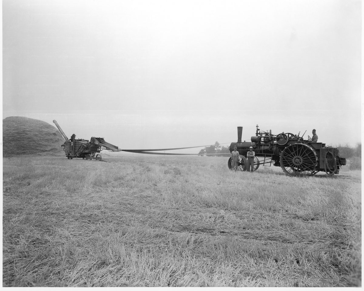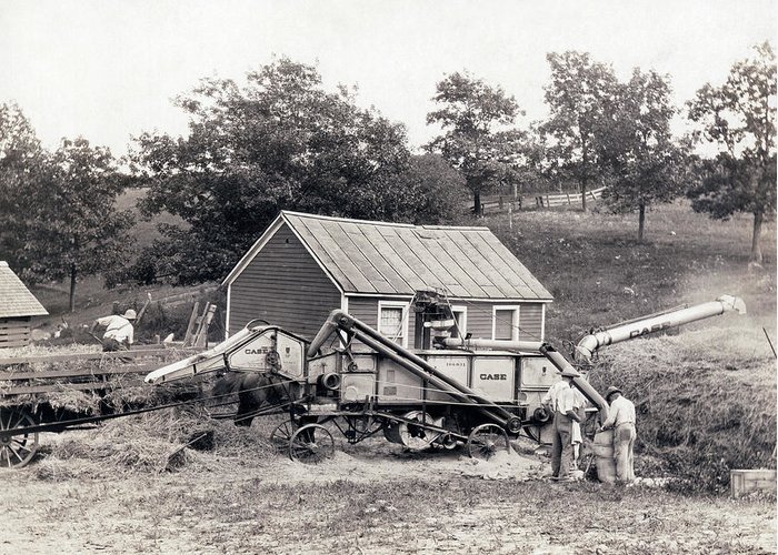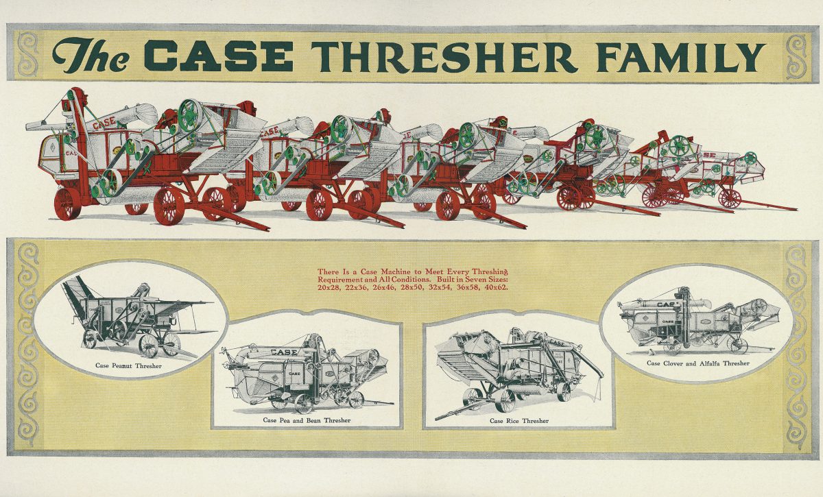 Toda la familia de trilladoras CASE para distintos cultivos. Foto del año 1925.