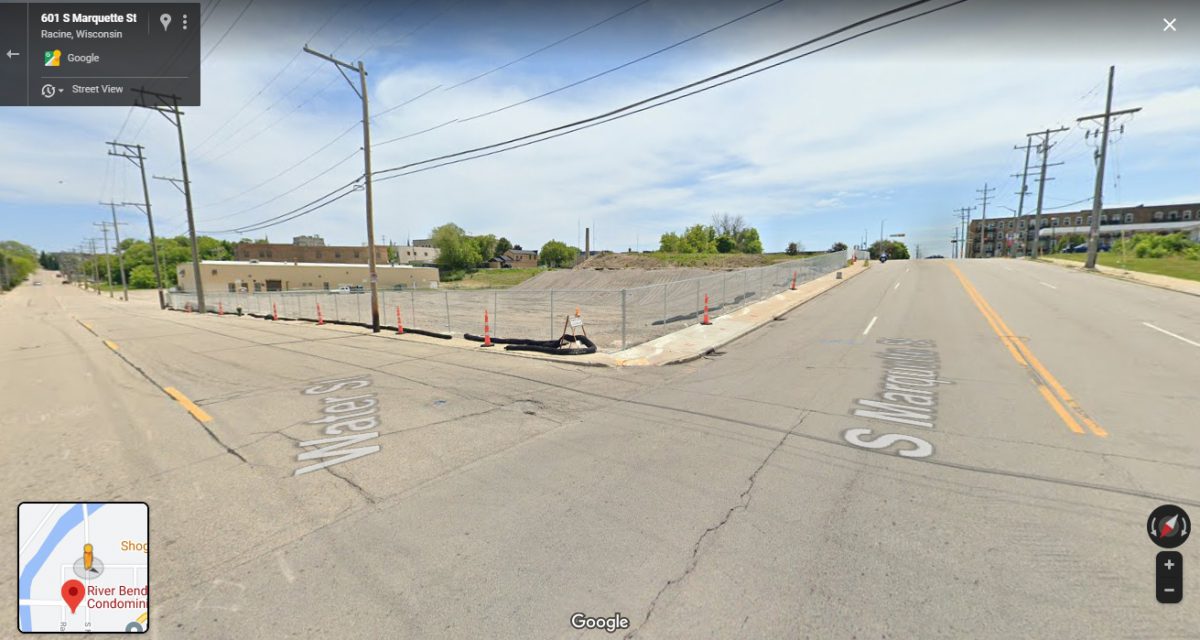 Esquina donde estuvo ubicado el edificio fabril de la JI Case Plow Works, esquina de Water Street y Marquette Street en Racine, Wisconsin.