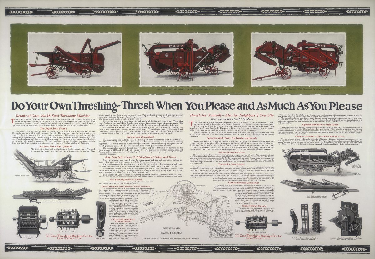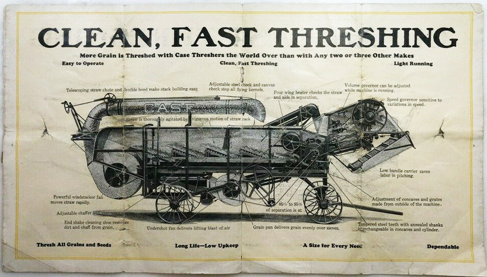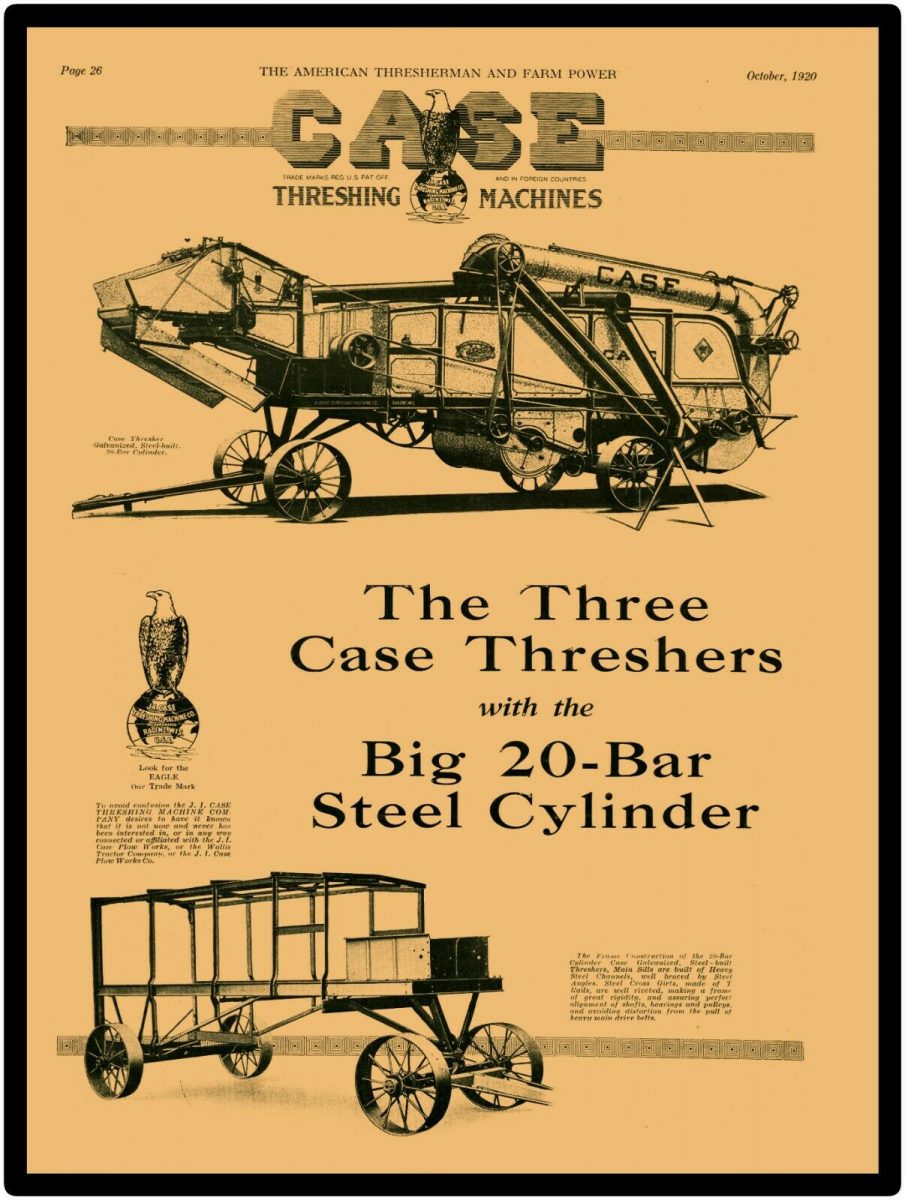 Trilladora CASE destaca el folleto de 1920 que es toda de acero y que el cilindro tiewne 20 barras.