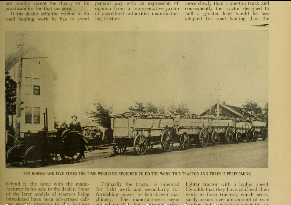 Foto año 1919 destaca que el tractor CASE con 10 Hp lleva 5 carros.