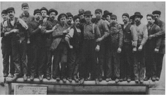 Foto de 1899. Se ven a 19 obreros de la JI Case Co, sobre una trilladora CASE. La idea era demostrar que era resistente.