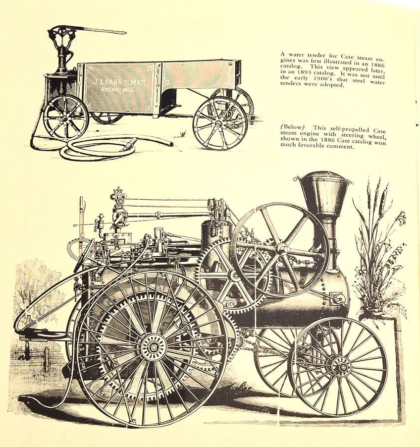 Foto de una máquina de vapor CASE autopropulsada y equipo proveedor de agua. Catálogo CASE del año 1886.