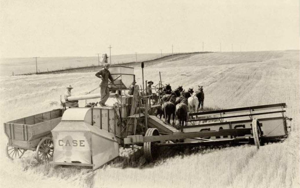 Espectacular foto de una trilladora combinada CASE arrastrada por caballos. Foto del año 1906.