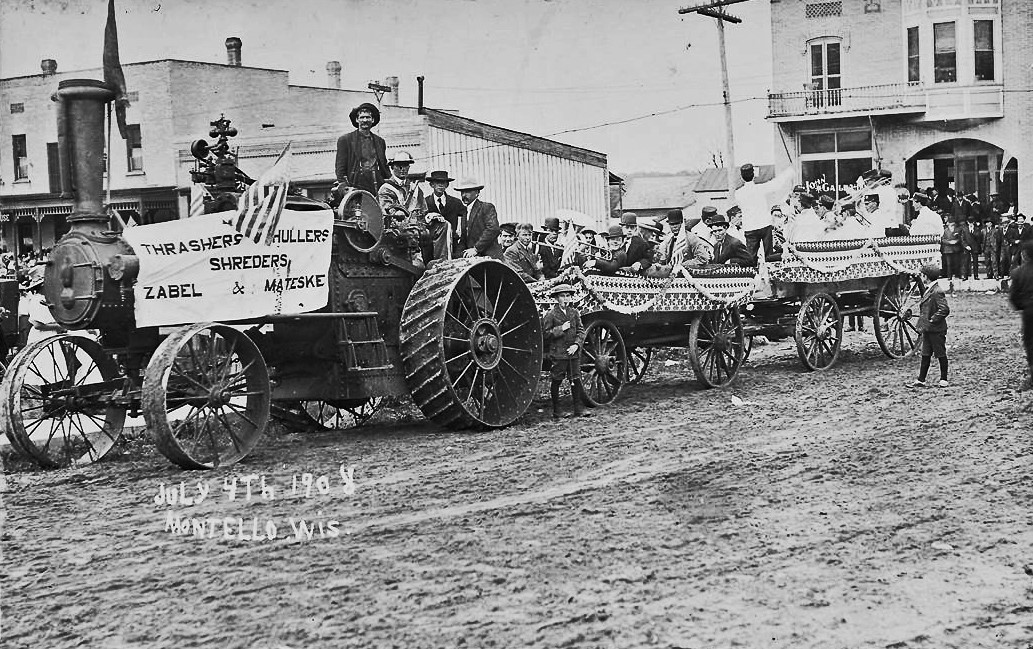 Un CASE a vapor de 15 Hp en un desfile del 4 de julio de 1908 en Montbello, Wisconsin. Cortesía facebook Gary Yaeger.