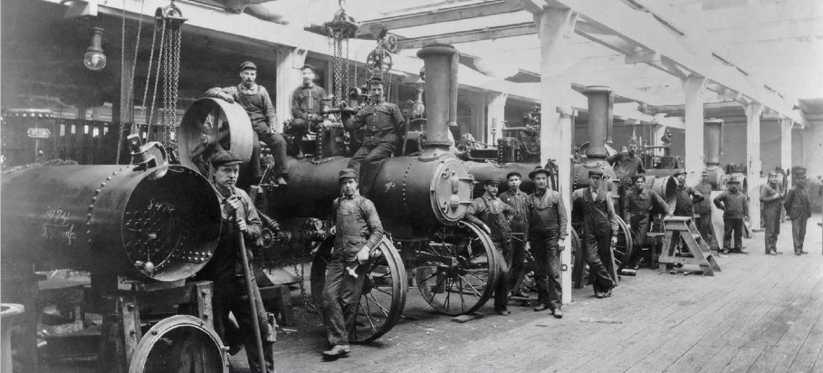 Foto del interior de la planta industrial Case, sección motores a vapor. Año 1900.