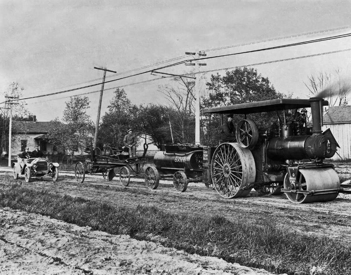 Motor a a vapor CASE con rueda apisonadora delantera, se usaba en la reparación de caminos. Foto aproximada 1915.
