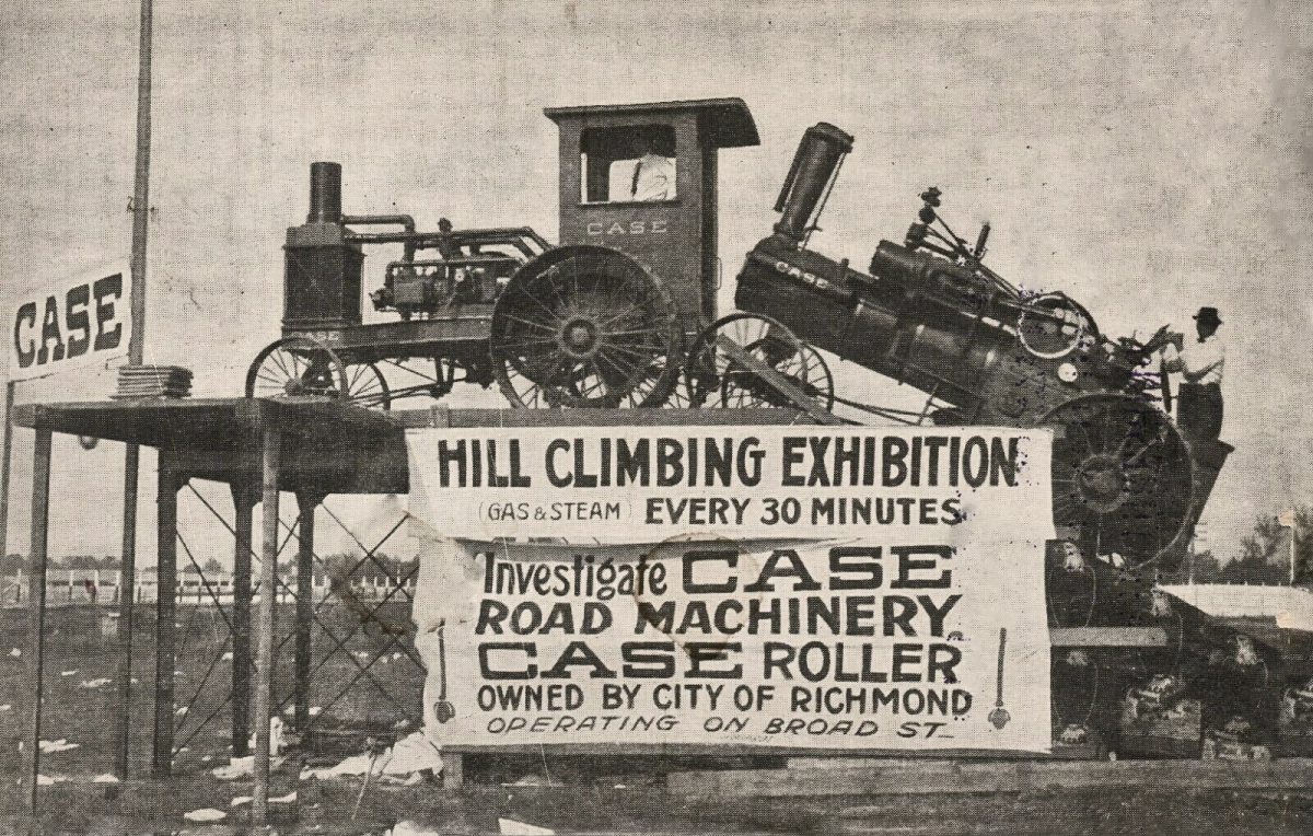 Fuente facebook de Gary Yaeger. Foto de una exposición de maquinaria. Se ve un CASE 40-20 arriba y en la rampa a un motor a vapor CASE de 25 Hp.