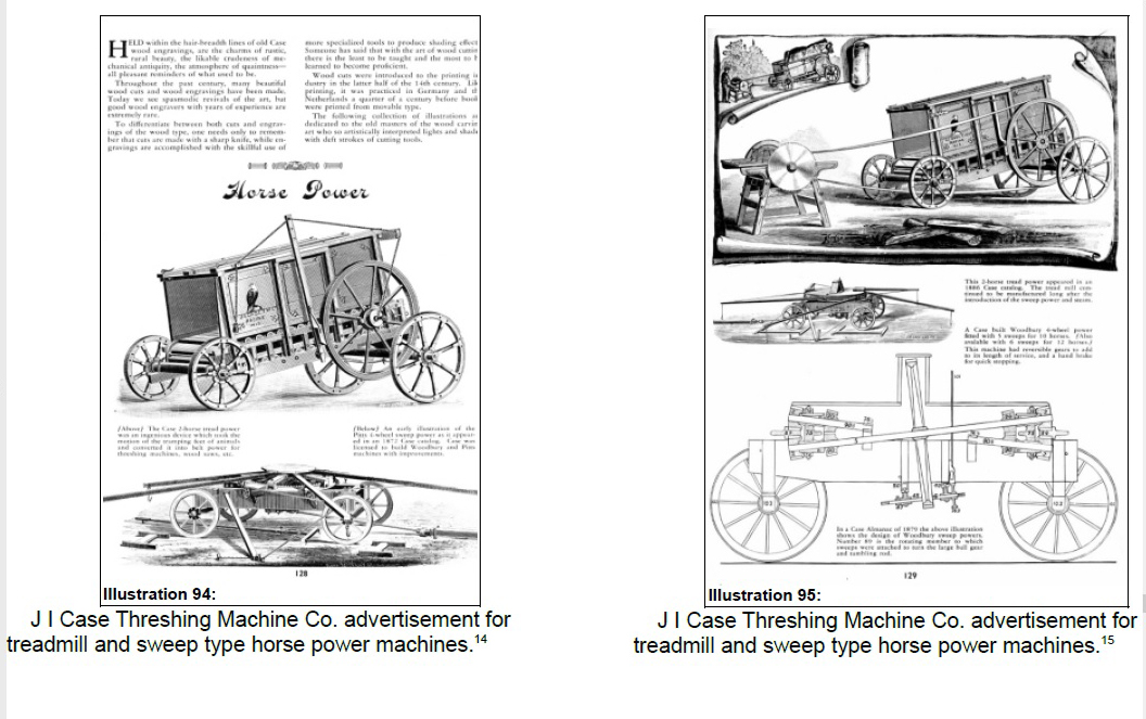 Ilustración de los 2 sistemas más económicos que había de potencia para hacer funcionar una trilladora a fines de 1800. CASE también fabricaba estos sistemas.