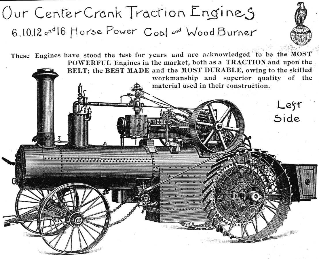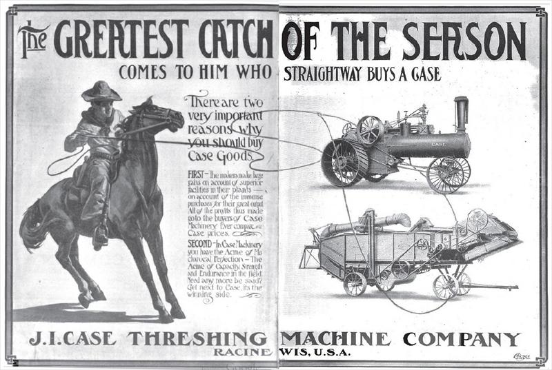 Publicidad de 1907 donde se destacaban tanto el tractor como la trilladora. Dice: «La mejor captura de la temporada» y muestra a un vaquero enlazando el tractor a vapor y la trilladora.