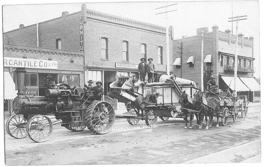 Un motor a vapor CASE 15 Hp traslada una máquina trilladora a través de Nampa, Idaho. Cortesía de la revista Iron Age