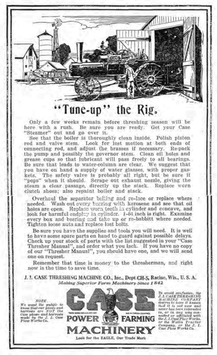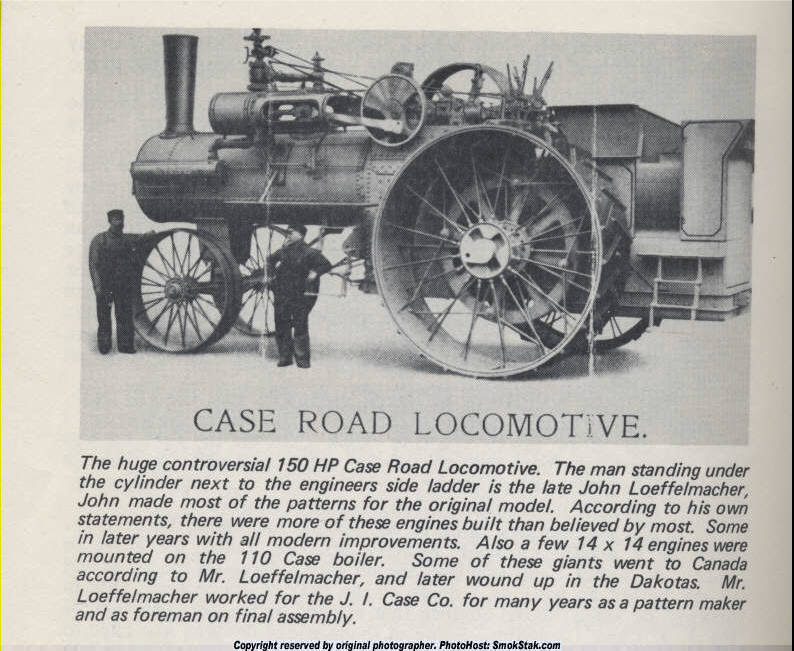 Traducción textual de la Nota periodística sobre el CASE 150 HP: «La enorme y controvertida locomotora de carretera CASE de 150 CV. El hombre parado debajo del cilindro al lado de la escalera del lado de los ingenieros es el difunto John Loffelmacher, John hizo la mayoría de los patrones para el modelo original. Según sus propias declaraciones, se fabricaron más de estos motores de lo que la mayoría creía. Algunos montados en la caldera CASE 110. Algunos de estos gigantes fueron a Canadá. El Sr. Lofferlmacher trabajó para J. I. Case Co. durante muchos años como fabricante de patrones y como capataz en el ensamblaje final».