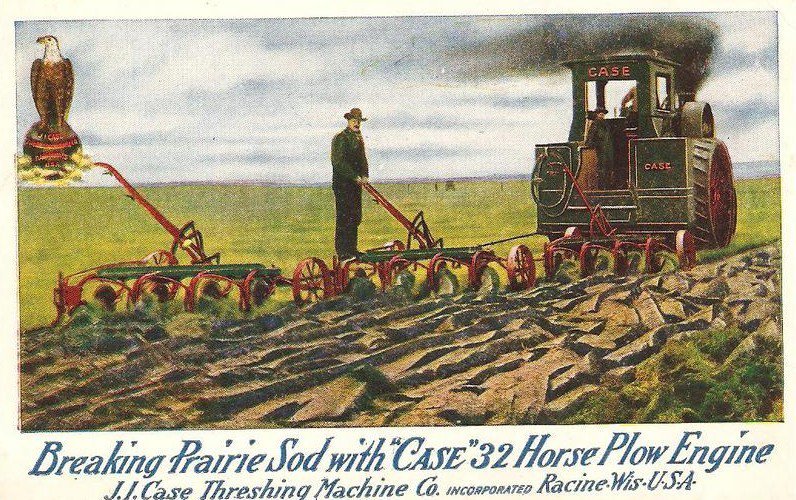 Postal de un motor a vapor Case de 32 CV arando una pradera.