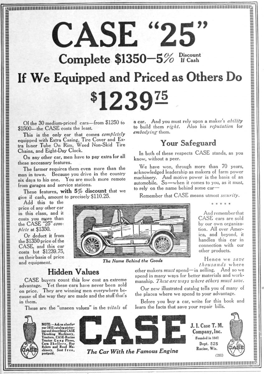 Publicidad del auto Case 25 del año 1915 y se ve el precio en dólares.