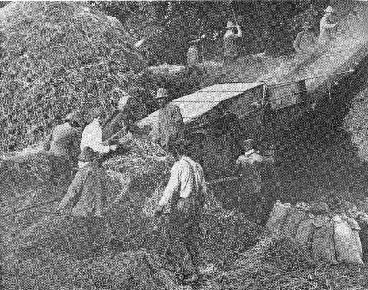 Trilladora CASE (Apron) a pleno trabajo. Foto de 1900 aprox.