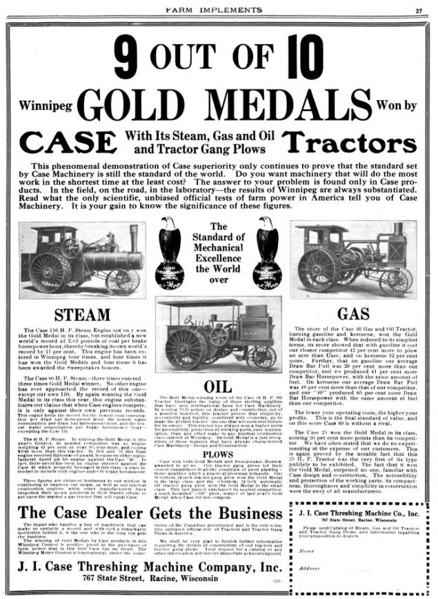 Anuncio publicitario que CASE publicó después del concurso de Winnipeg de 1913 en el cual ganó 9 de 10 medallas.