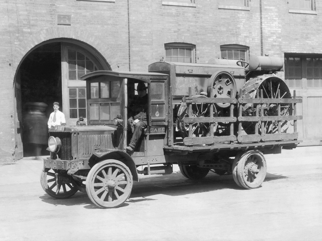 La foto no parece ser tan antigua, pero sí se trata de uno de los primeros motores a vapor fabricados por la empresa CASE que están descargando de un camión.