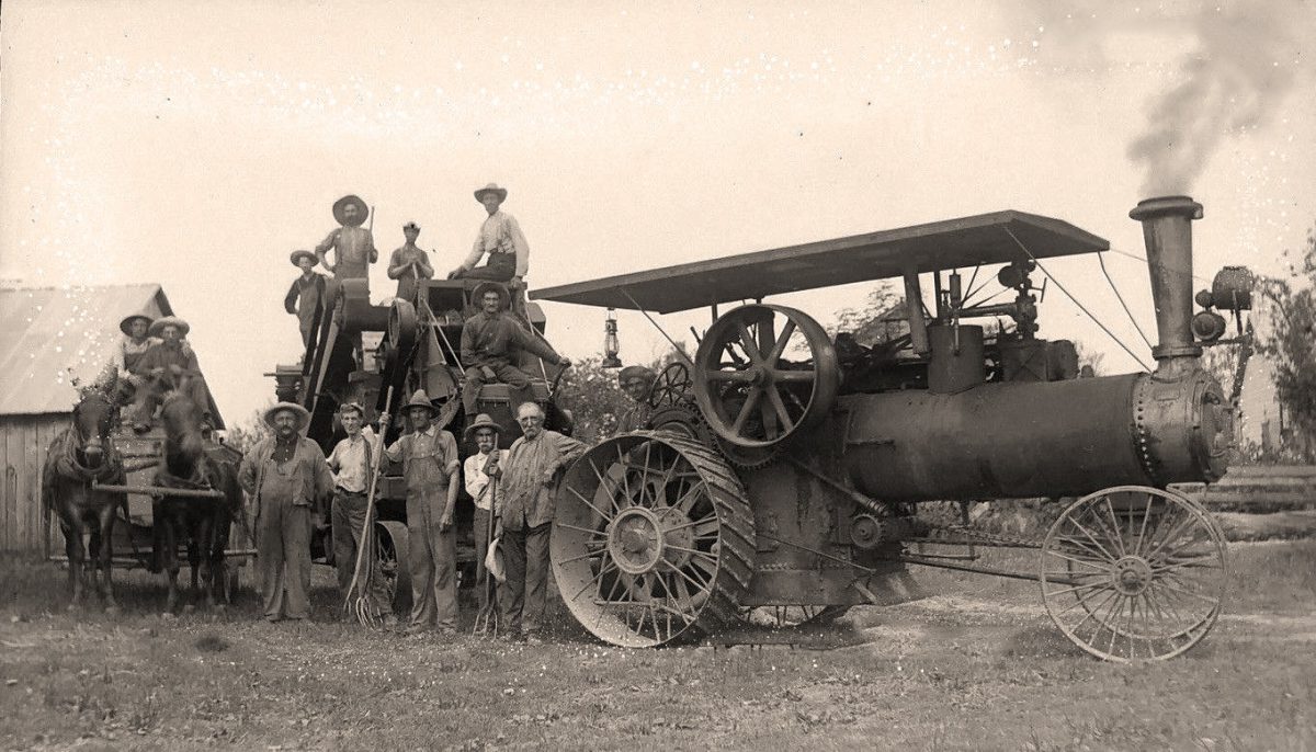 Foto del año 1920, se ve el trabajo de trilla con una máquina CASE.