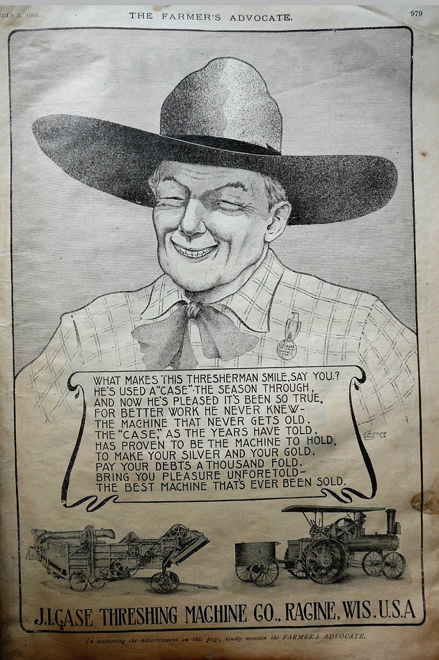 Publicidad de CASE del año 1905 dice: ¿Qué hace sonreír a este trillador? y responde: Ha usado un CASE durante toda la temporada y ahora está contento!