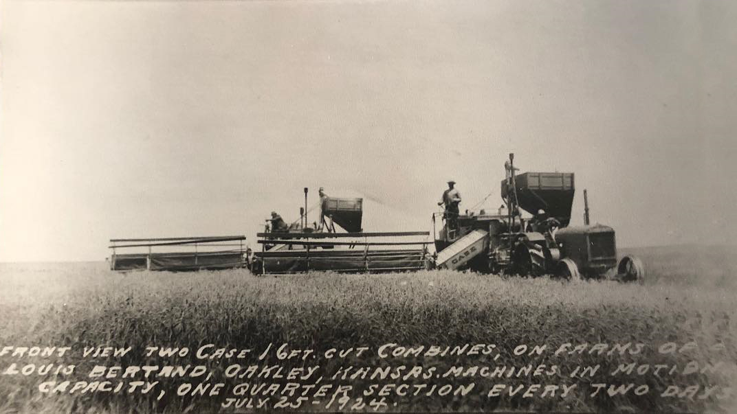 Dice textual: «Foto frontal de 2 cosechadoras CASE combinadas de 16 pies de corte en las granjas de LUIS BERTAND OAKLEY KANSAS. Máquinas en movimiento capacidad, un cuarto de sección cada dos días 25 julio de 1924».