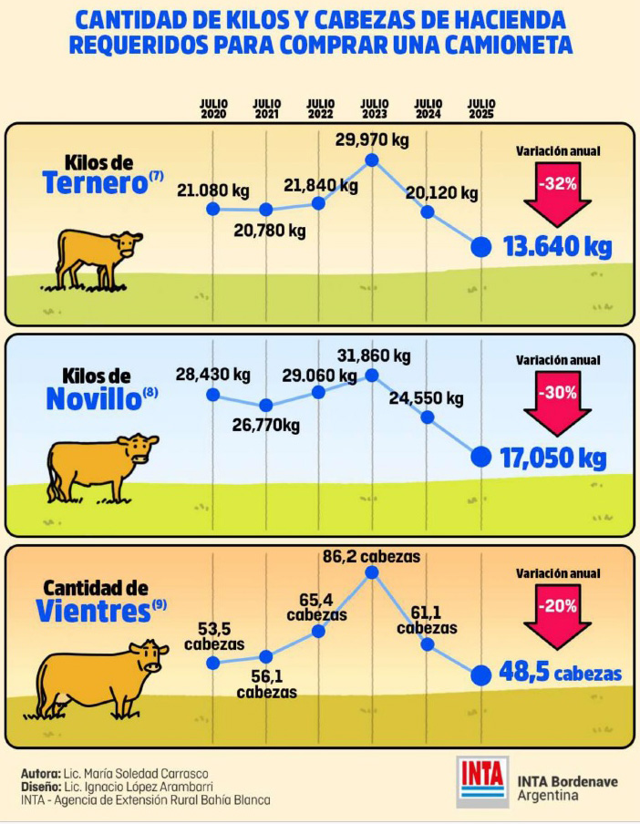 Con un valor de camioneta en torno a $ 53 millones, los datos expuestos indican que a julio de 2025 se necesitan 13.640 kg de ternero (un 32% menos que en julio de 2024) y 17.050 kg de novillo (una baja del 30% interanual), para acceder al mismo vehículo.